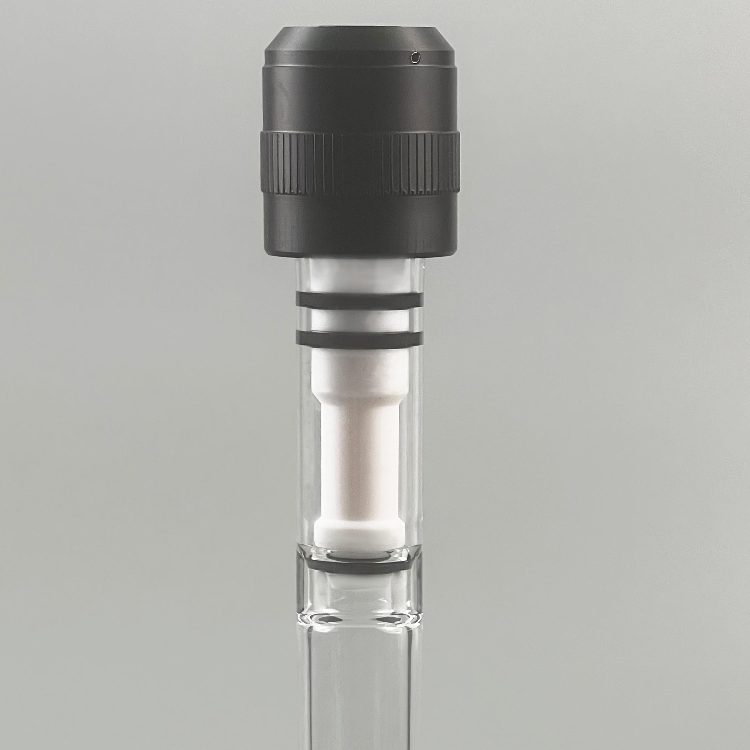 PTFE High Vacuum Valve, Exposed Viton O-Rings, Rapid Releasing Black Acetal Control Cap and Extra Coarse Thread Straight Glass Barrel.